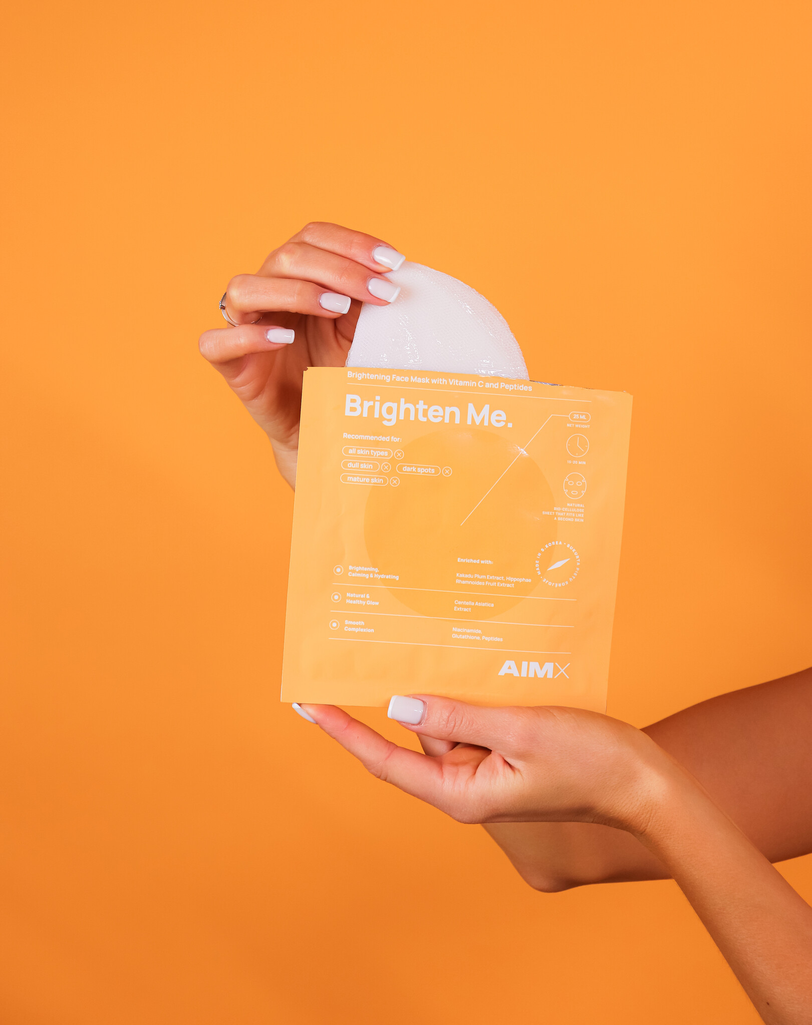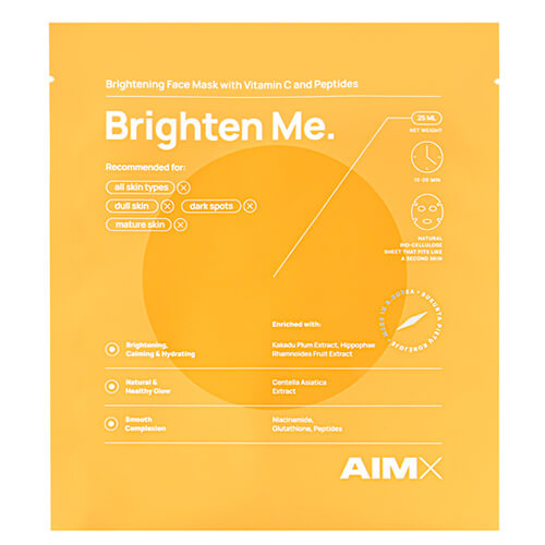 Aimx Brighten Me is een vliesmasker dat de doffe huid een boost geeft. Het masker is doordrenkt met 22 actieve ingrediënten, waaronder vitamine c en kakadu pruim (een sterke antioxidant). Daarnaast bevat het glutathion, niacinamide (vitamine B3), hyaluronzuur en twee verschillende peptides. Het masker is gemaakt van 100% bio-cellulose dat aanvoelt als een tweede huid. Brighten Me geeft de huid een boost en een stralende glans.